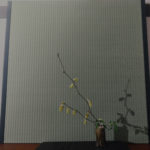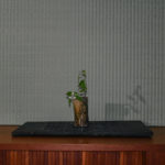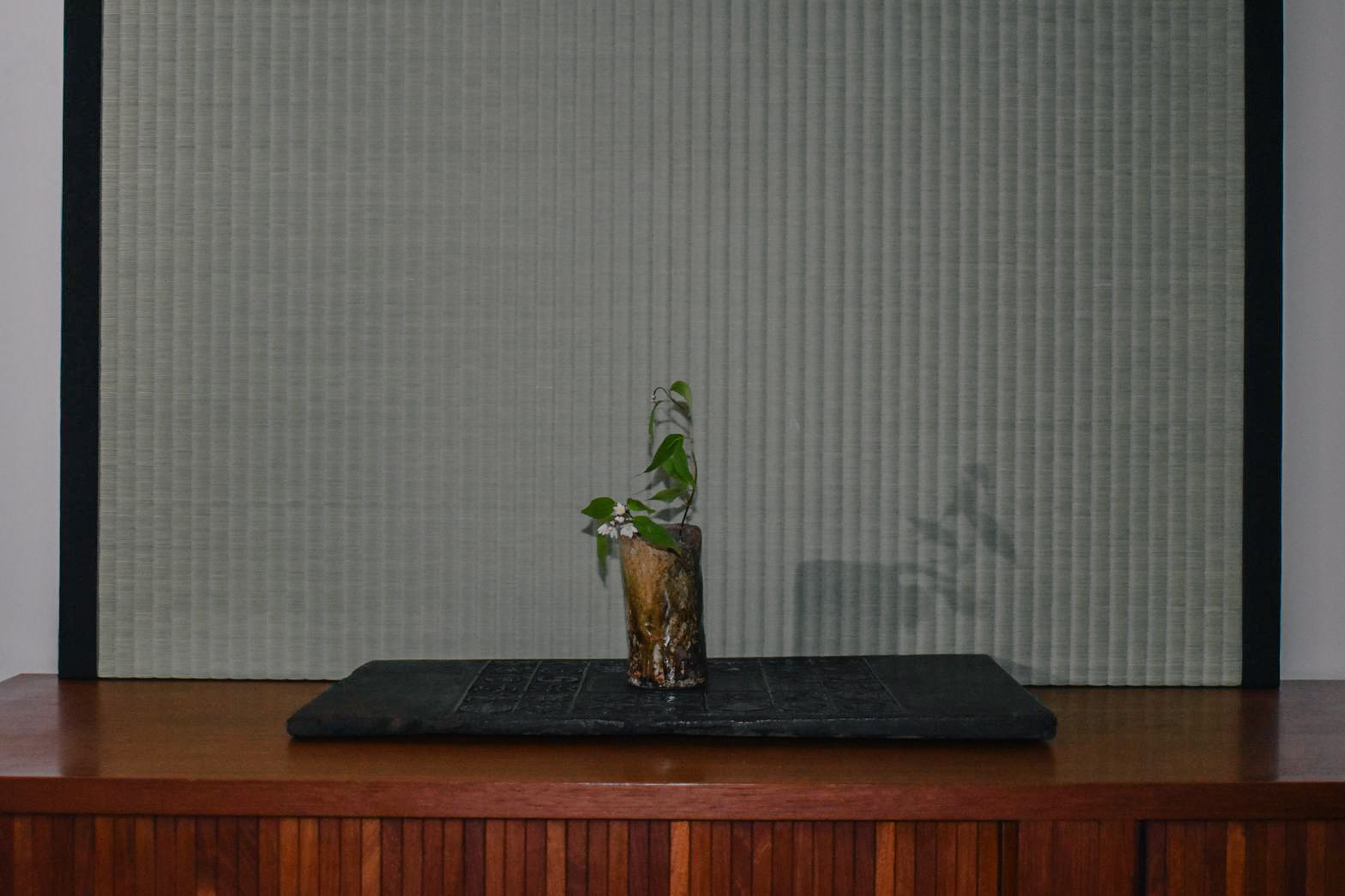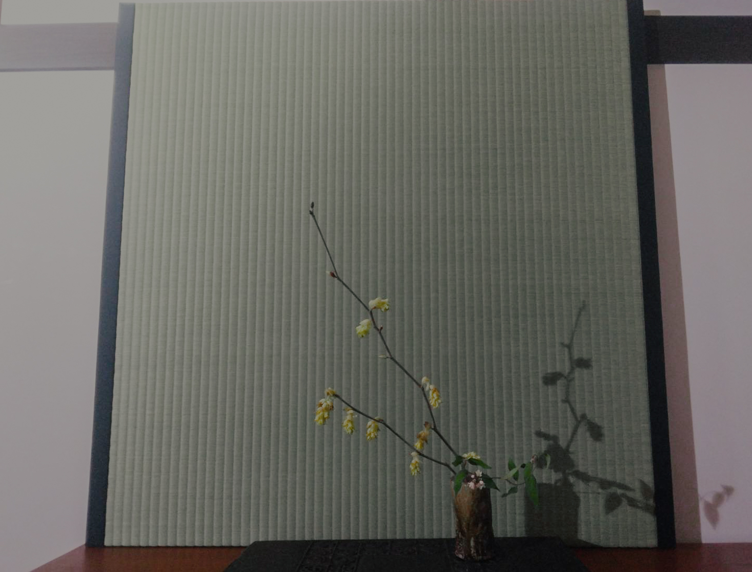 The customer used the tatami mats standing on the cabinet as a backdrop for ikebana arrangement.